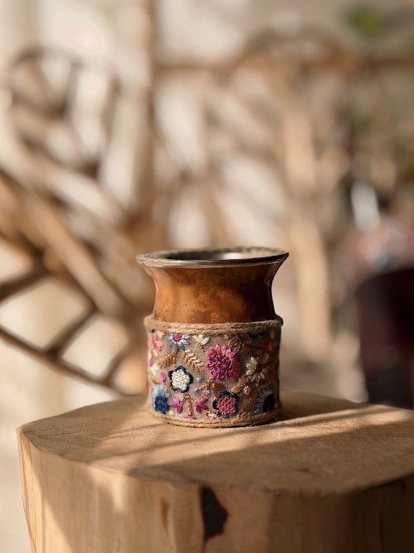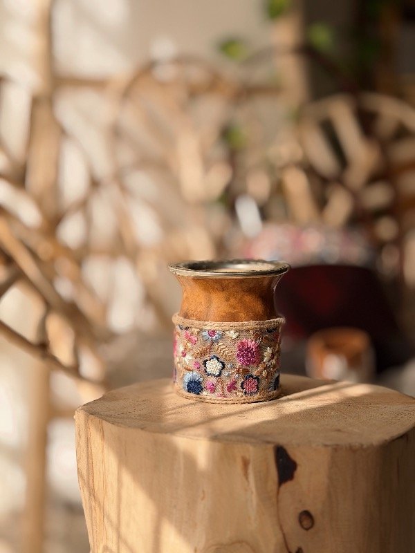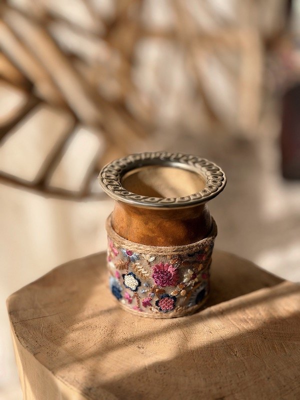 Mate de calabaza. Base 100% cuero intervenido con bordado - diseños únicos -