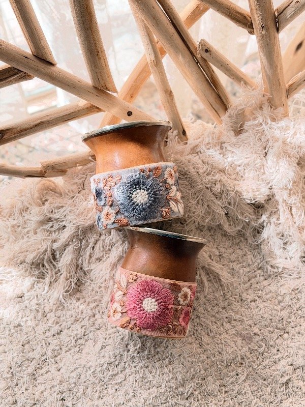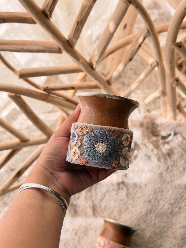 Mate de calabaza. Base 100% cuero intervenido con bordado - diseños únicos -