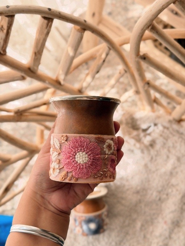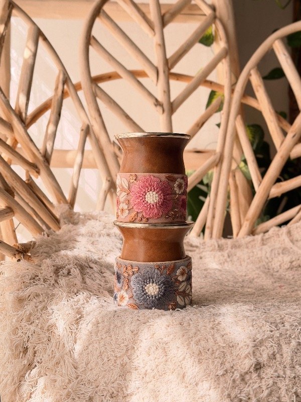 Mate de calabaza. Base 100% cuero intervenido con bordado - diseños únicos -