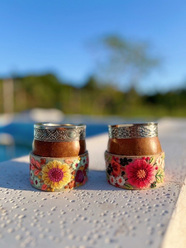 Mate imperial de calabaza y virola de acero . Base 100% cuero intervenido con bordado - diseños únicos -