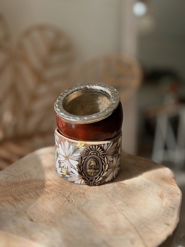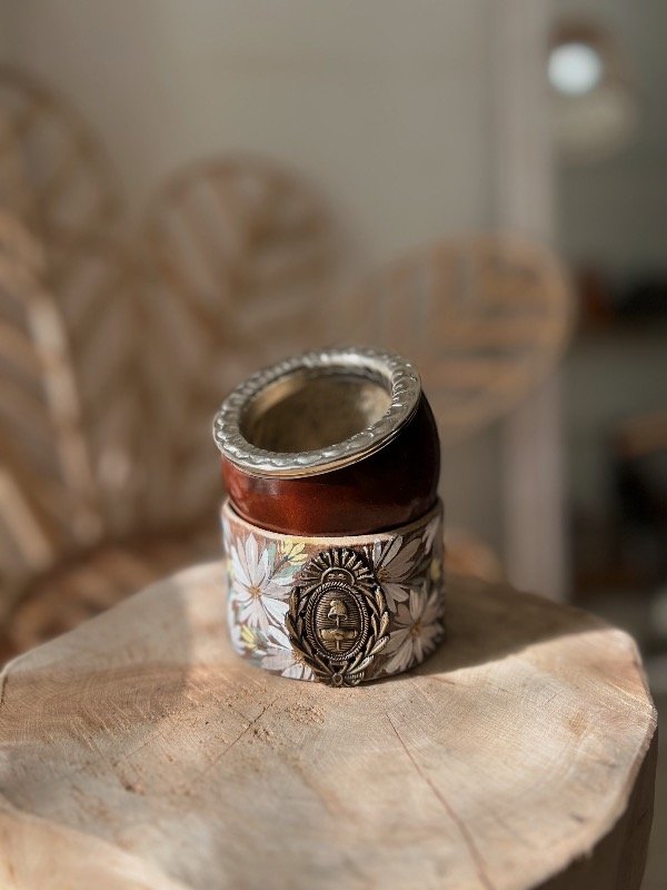 Mate de calabaza y virola de alpaca cincelada. Base 100% cuero con escudo y detalles pintados a mano.