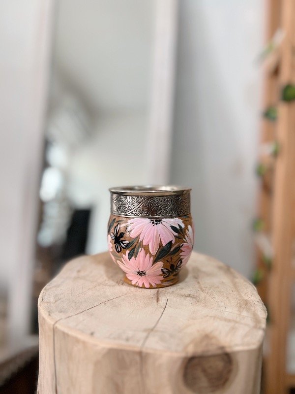 Mate de algarrobo con virola y fleje 100% alpaca cincelada. Pintado a mano, súper protegido para que el diseño no corra ningún tipo de riesgo ❤️