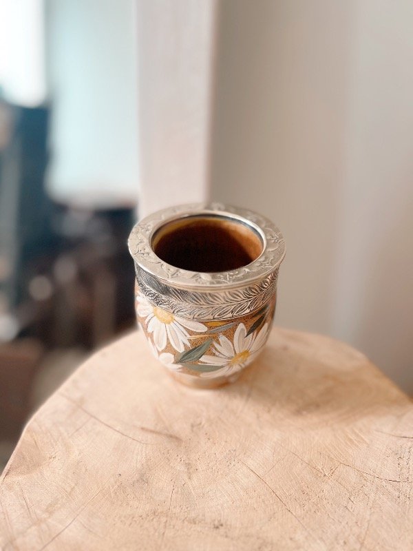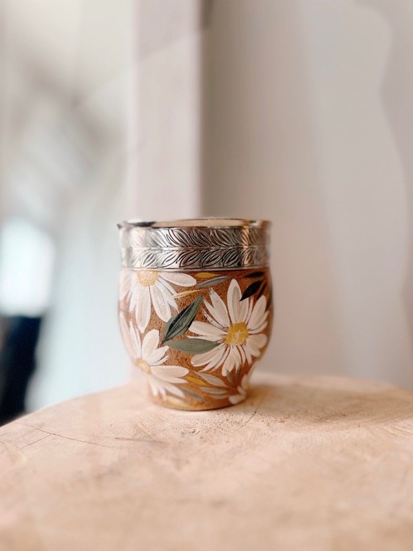 Mate de algarrobo con virola de alpaca cincelada, pintado a mano. ✨CON BOMBILLA 100% ACERO DE REGALO✨